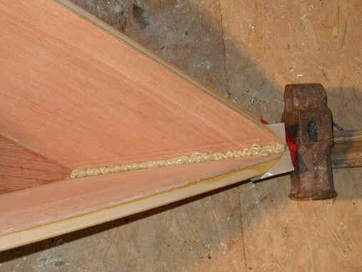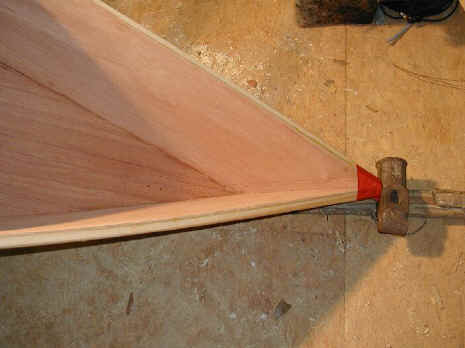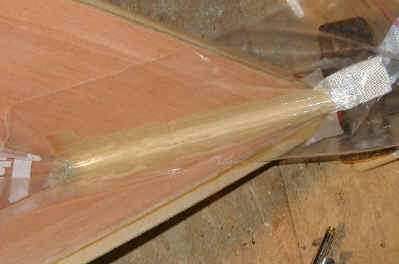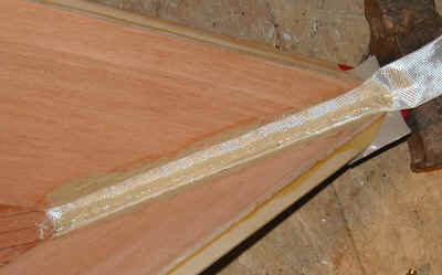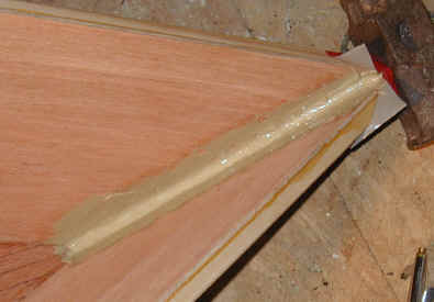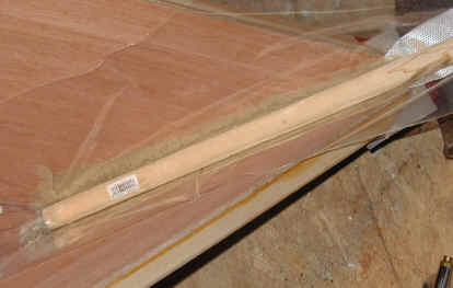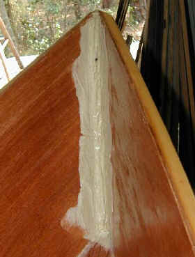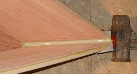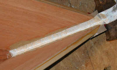 I was all ready to epoxy and glass the stem of a double paddle canoe when I read a conversation on Gavin Atkin's Mouse Boats list about using PL Premium and glass. David Colpits has been experimenting with it as a substitute for Epoxy in the Stitch and Glue method. So I decided to give it a try. I used 2" glass tape, plenty of PL, rubber gloves, squeegees, a sheet of plastic and a 7/8" wooden dowel. I keep WD-40 around in case I get any on me. It takes the stuff off well if you catch it right away. Caution! Please be careful with this glue - some folks have allergic hive and rash like reactions to it.