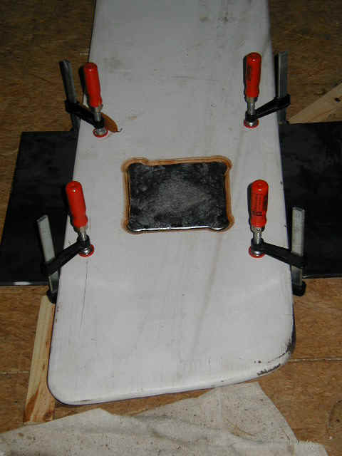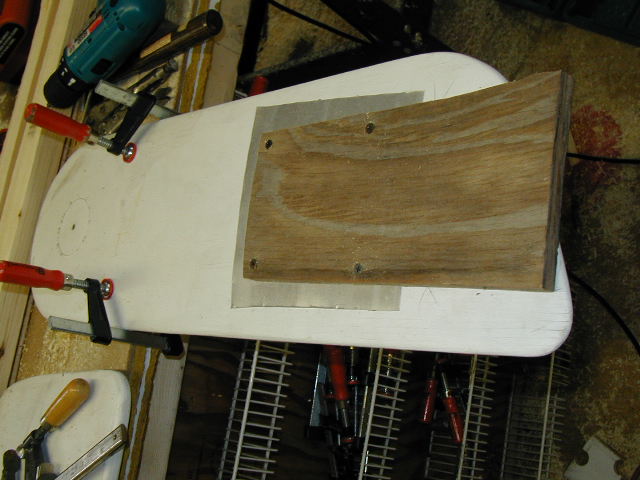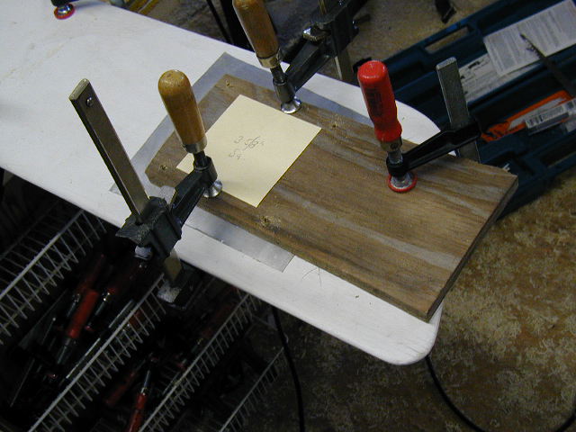 Jim clamps his board to a steel plate, but I don't have one. So I used some roof flashing backed up by a piece of plywood screwed tight with drywall screws.