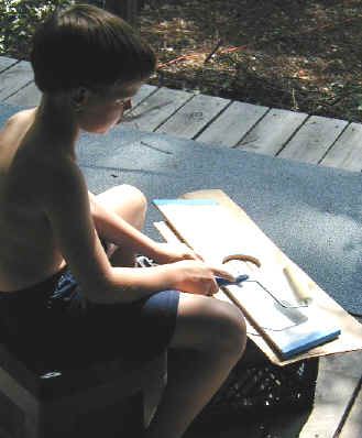 The seat is made of 2 slats of 1x4 conected by 3 1x2 cross pieces. The boys sand the pieces then screw them together.
